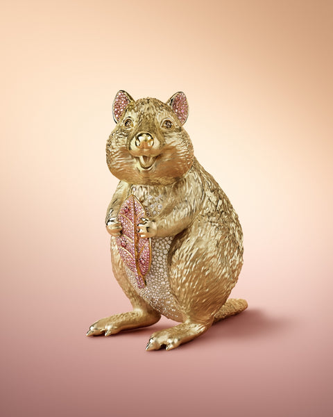 Linneys unveiled the Argyle Pink™ Quokka, a dazzling creation limited to three pieces worldwide. Encrusted with over 14cts of Argyle pink, champagne, and white diamonds set in 280g of 18K gold, this masterpiece celebrates two Western Australian icons – the rarest pink diamonds in the world, and the beloved quokka.