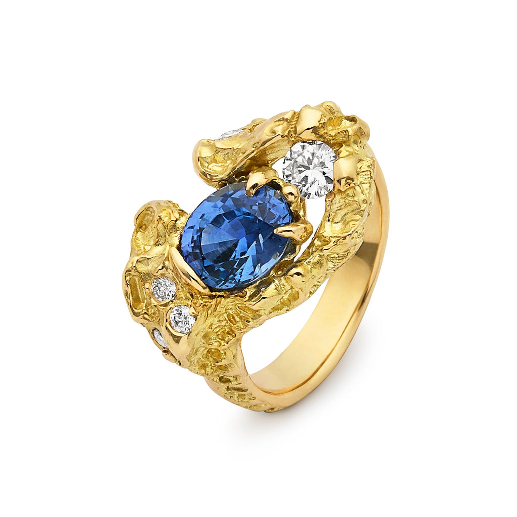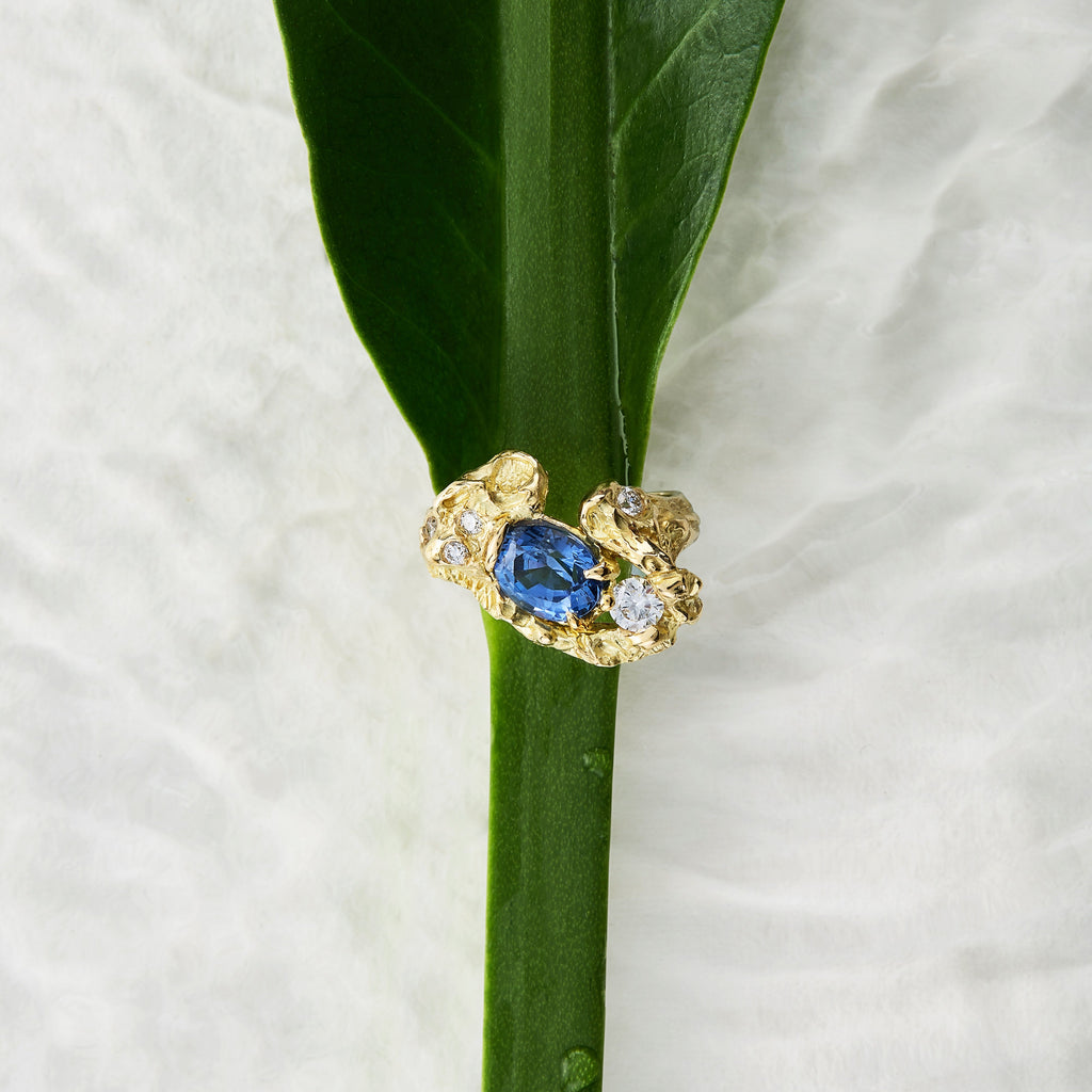 Crafted in 18ct yellow gold, the Blue Alchemy ring features a 2.40ct oval-cut Ceylon sapphire set at the centre. Accenting the sapphire is one 0.25ct FG/SI round brilliant cut diamond, complemented by four 0.03ct and one 0.06ct FG/SI round brilliant cut diamonds integrated into the organic design of the band.