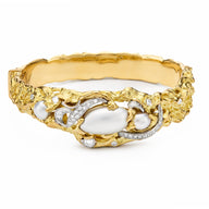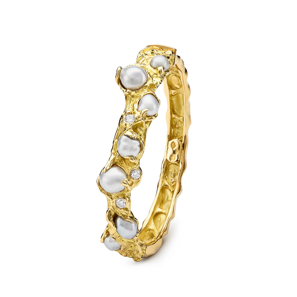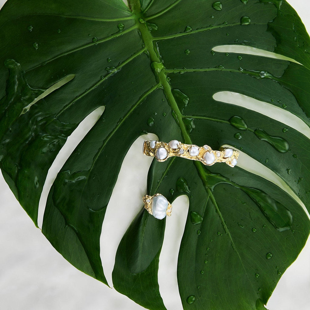 Crafted in 18ct yellow gold, the Coral Bloom hinged bangle features seven white semi-baroque Australian South Sea seedless pearl, measuring 6-7mm to 7-8m, scattered across the top half of the bangle. The pearls display very good lustre with natural surface characteristics.