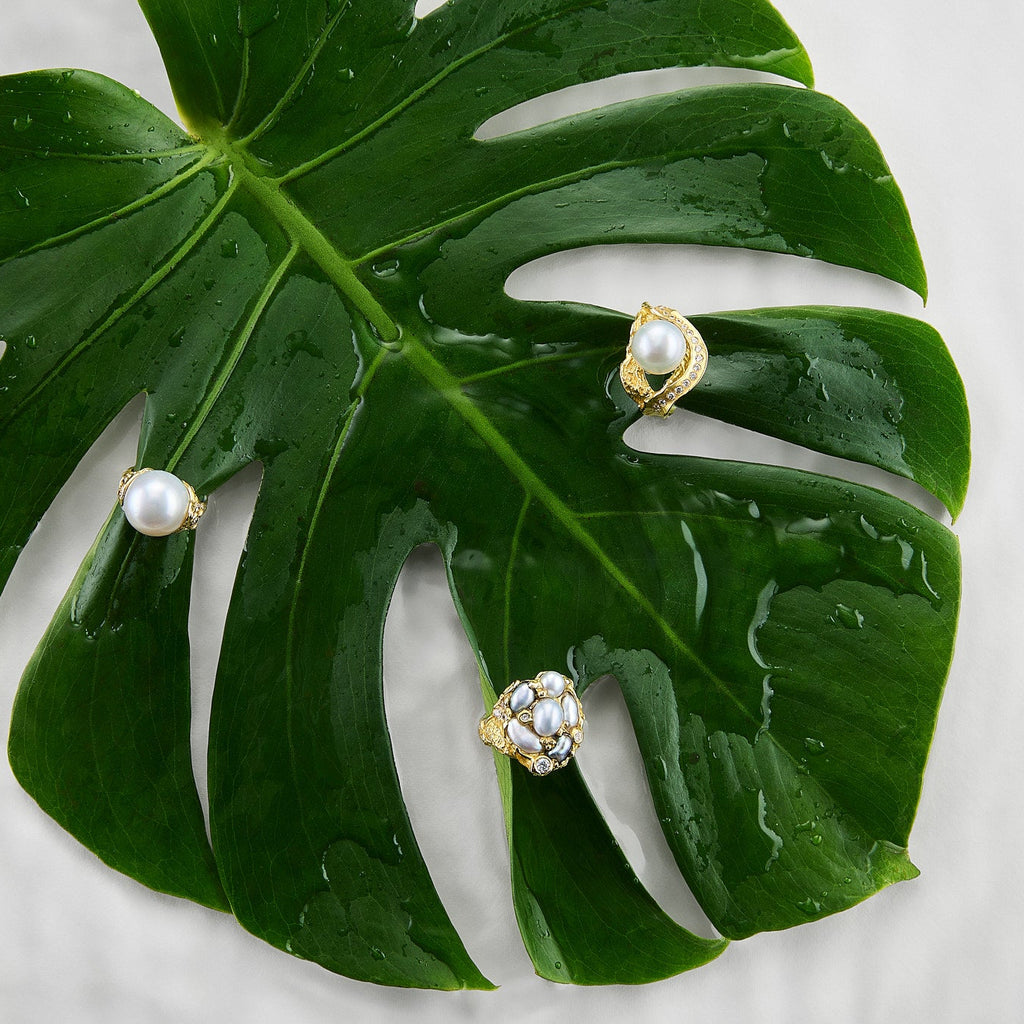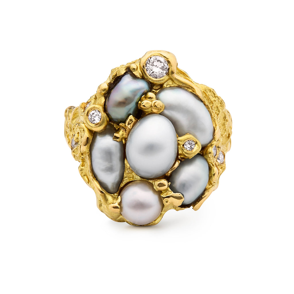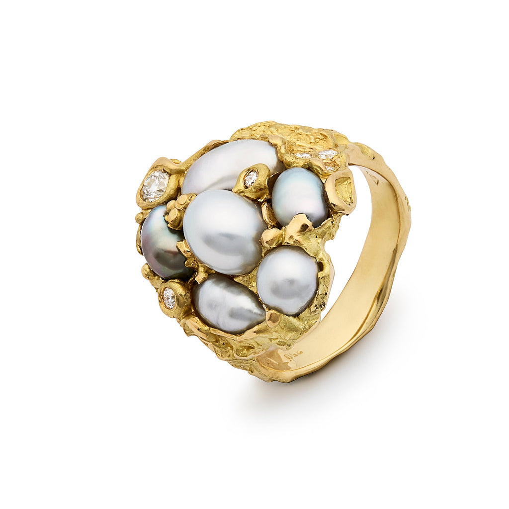 Crafted in 18ct yellow gold, the Pearl Atoll ring features a 6–7mm white semi-baroque Australian South Sea seedless pearl of excellent lustre at its centre. Surrounding the central pearl are four 5–6mm white and one 5–6mm silver semi-baroque Australian South Sea seedless pearls with very good lustre, creating a clustered, organic composition.