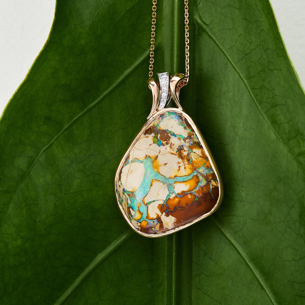 Crafted in 18ct rose and white gold, the River Runs pendant features a 44.64ct freeform Australian boulder opal, showcasing rivers of light and flashes of green, orange, and red play-of-colour. The opal is bezel set in rose gold, emphasizing its natural form.