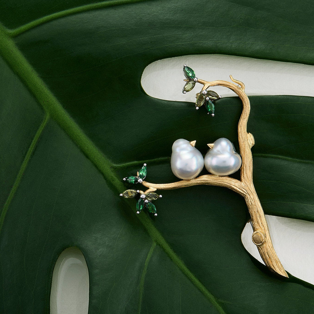 The birds sit on a wood-textured 18ct yellow gold branch, with leaves at the ends set with six 4×2mm marquise-cut tsavorite garnets and five 4×2mm marquise-cut peridots, all claw set in 18ct white gold. The brooch is completed with an 18ct white gold pin at the back for secure wear.