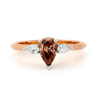 Alluring and unique, this emerald cut champagne diamond is embraced by two trilliant cut diamonds, creating a captivating display of sparkle.