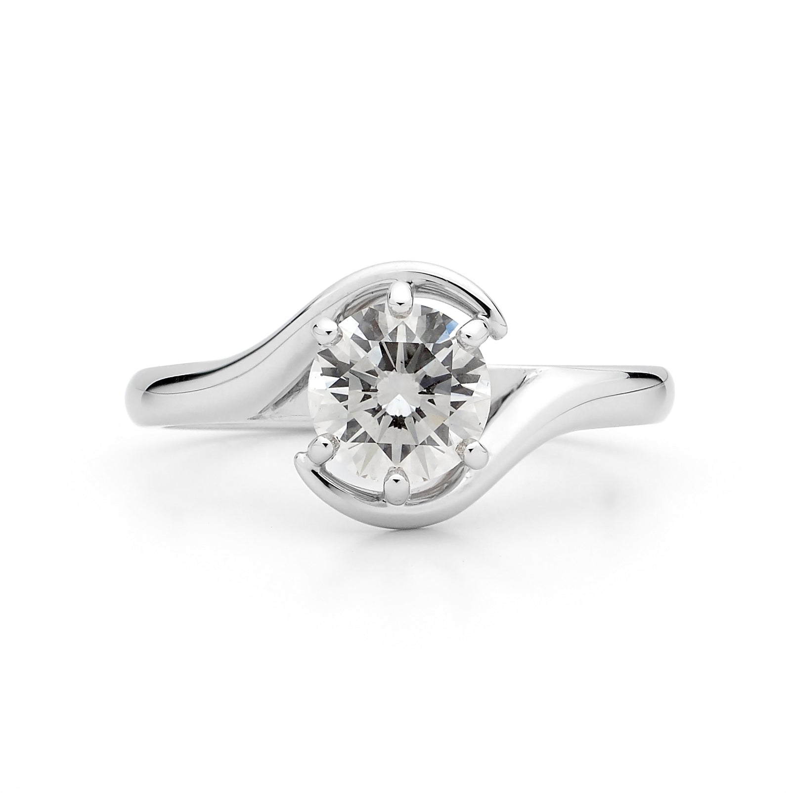 This elegant and understated solitaire design delicately embraces a stunning round brilliant cut diamond with flowing sinuous lines.