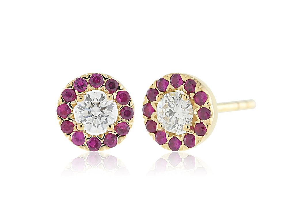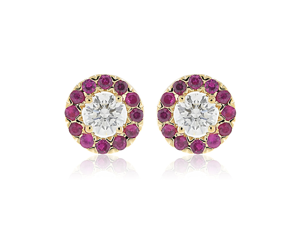 One pair of 18ct yellow gold diamond and ruby earrings featuring 2 round brilliant cut diamonds claw set in the centre of the earrings surrounded by 24 rubies. The earrings are finished with post and butterfly fittings and have a polished finish.