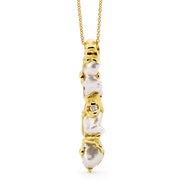 This 18ct yellow gold half moon shaped pendant features a white semi baroque shaped Australian South Sea seedless pearl fitted to an articulated jump ring at the base of the pendant which has a textured finish with polished highlights on the front and polished finish on the back.