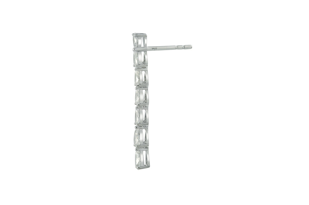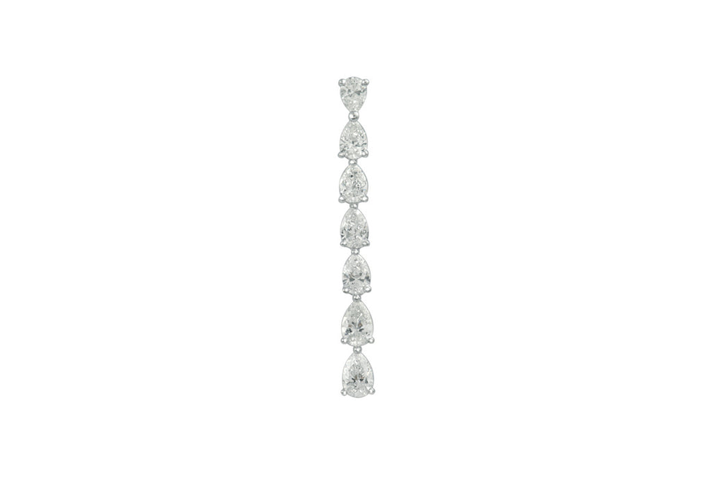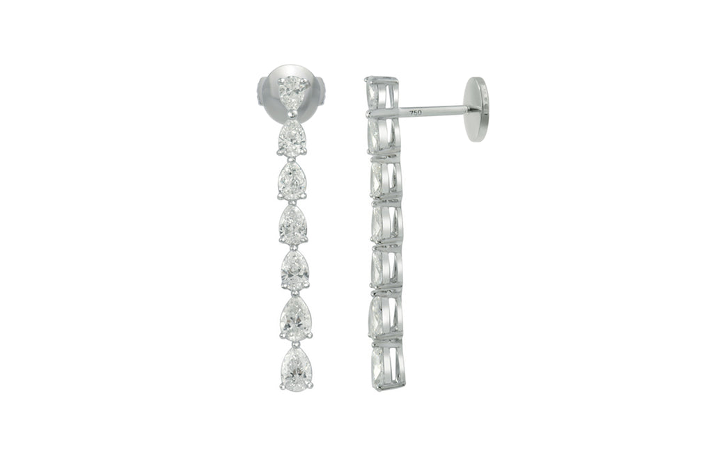 One pair of 18ct white gold diamond earrings featuring 4=0.58ct, 8=0.72ct, 2=0.15ct  pear cut diamonds claw set along the articulated drop style earrings which have post and butterfly fittings and a polished finish.