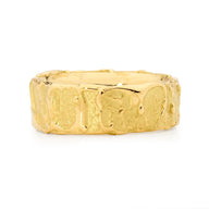 With a textured woodgrain finish, this men's ring embraces both traditional simplicity and modern individuality. handcrafted in 18ct yellow gold, the ring measures approximately 7mm wide with a woodgrain texture and polished highlights.