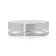 Crafted in 18ct white gold, this men’s wedding ring features alternating polished and satin finishes and measure 6.5mm wide.