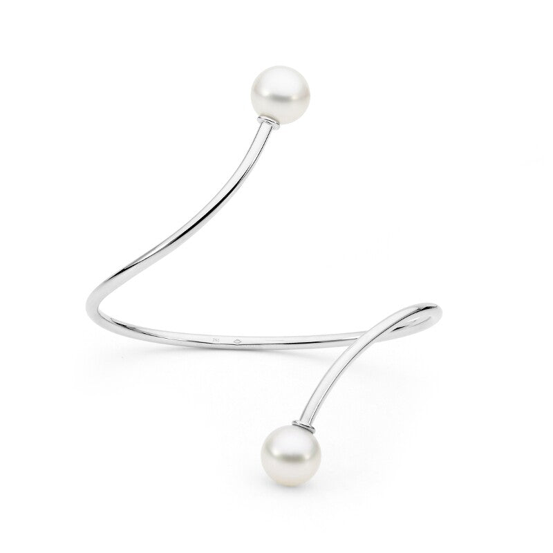 This beautiful cuff bangle design features two 10-11mm white button shaped Australian South Sea cultured pearls set onto the ends of the white gold wrap around bangle. The bangle has a polished finish.