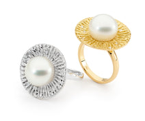Crafted in 18ct white gold, this pearl and diamond ring showcases an Australian South Sea baroque seedless pearl. A split band emphasises the unique shape of the pearl, which shimmers with round brilliant cut diamonds.