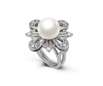 Crafted in 925 sterling silver and 24ct yellow gold, this pearl and diamond ring features three Australian South Sea baroque seedless pearls set on a textured silver disc that glimmers with a hint of diamonds, total 0.0585 carats.