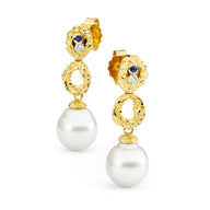 18ct white gold sapphire and diamond earrings featuring oval cut sapphires four claw set in the centre of the earrings with pear cut diamonds and tapered baguette cut diamonds claw set around the centre stones.
