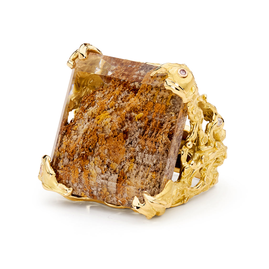 Handcrafted in 18ct yellow and rose gold, this ring features a naturally included Quartz with round brilliant cut pink and white diamonds.