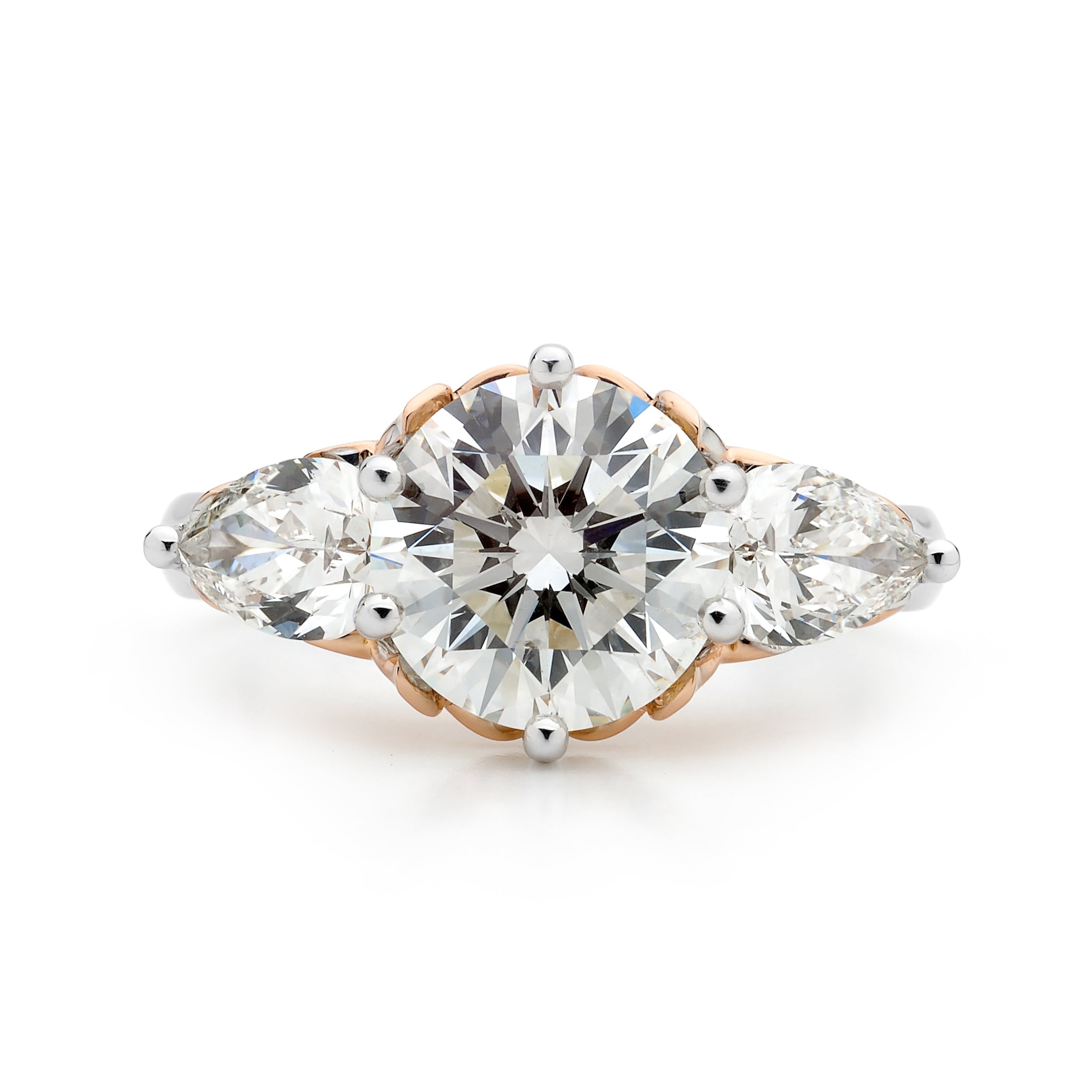 This 18ct white gold ring features a round brilliant cut diamond, given prominence by two pear cut diamond side stones. An exquisite 18ct rose gold gallery is detailed with two pink diamonds bezel set in 18ct white gold in the centre.  A perfectly round 18ct white gold band completes this exceptional design.