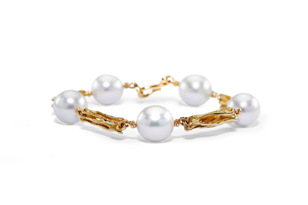 A uniquely Linneys design, this 18ct yellow gold bracelet features 5 lustrous 12-13mm Australian South Sea pearls and is finished by a polished ‘S’ clasp.